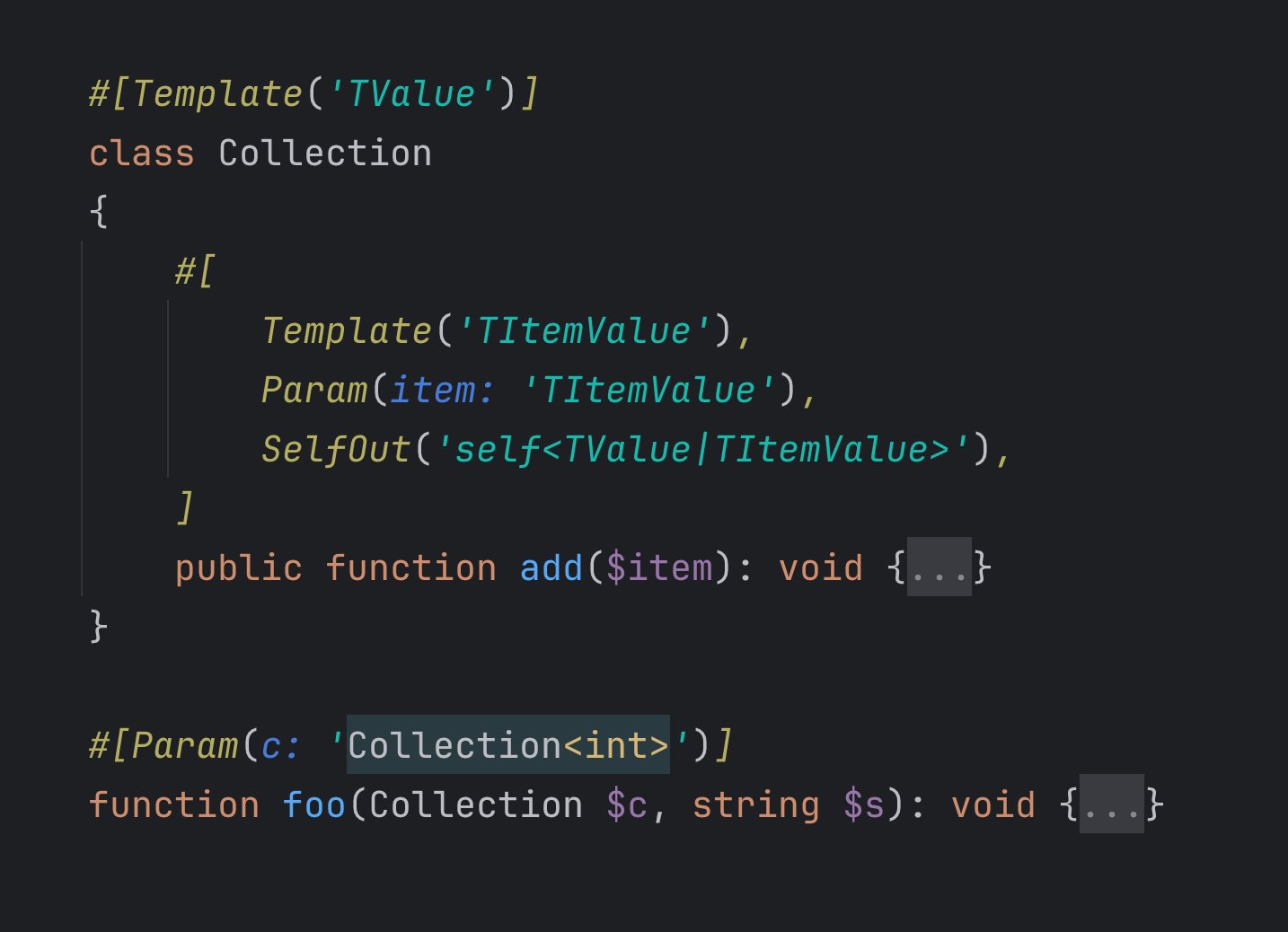 Идея, появившаяся в одном из обсуждений в Twitter, теперь получила достойную реализацию, позволяя указывать метаданные типов для функций и классов в атрибутах PHP 8 вместо тегов PHPDoc.